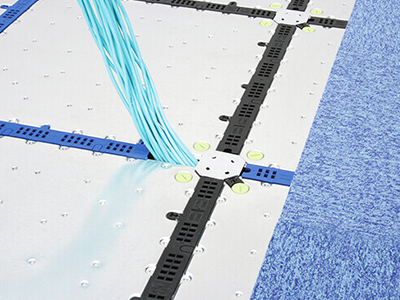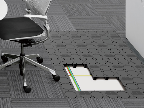 完成したOAフロアの床下空間に、電源やLANケーブルなどを配線します。そして、オフィスのレイアウトに合わせて、デスクや複合機を置く場所へ的確にケーブルを引き出します。